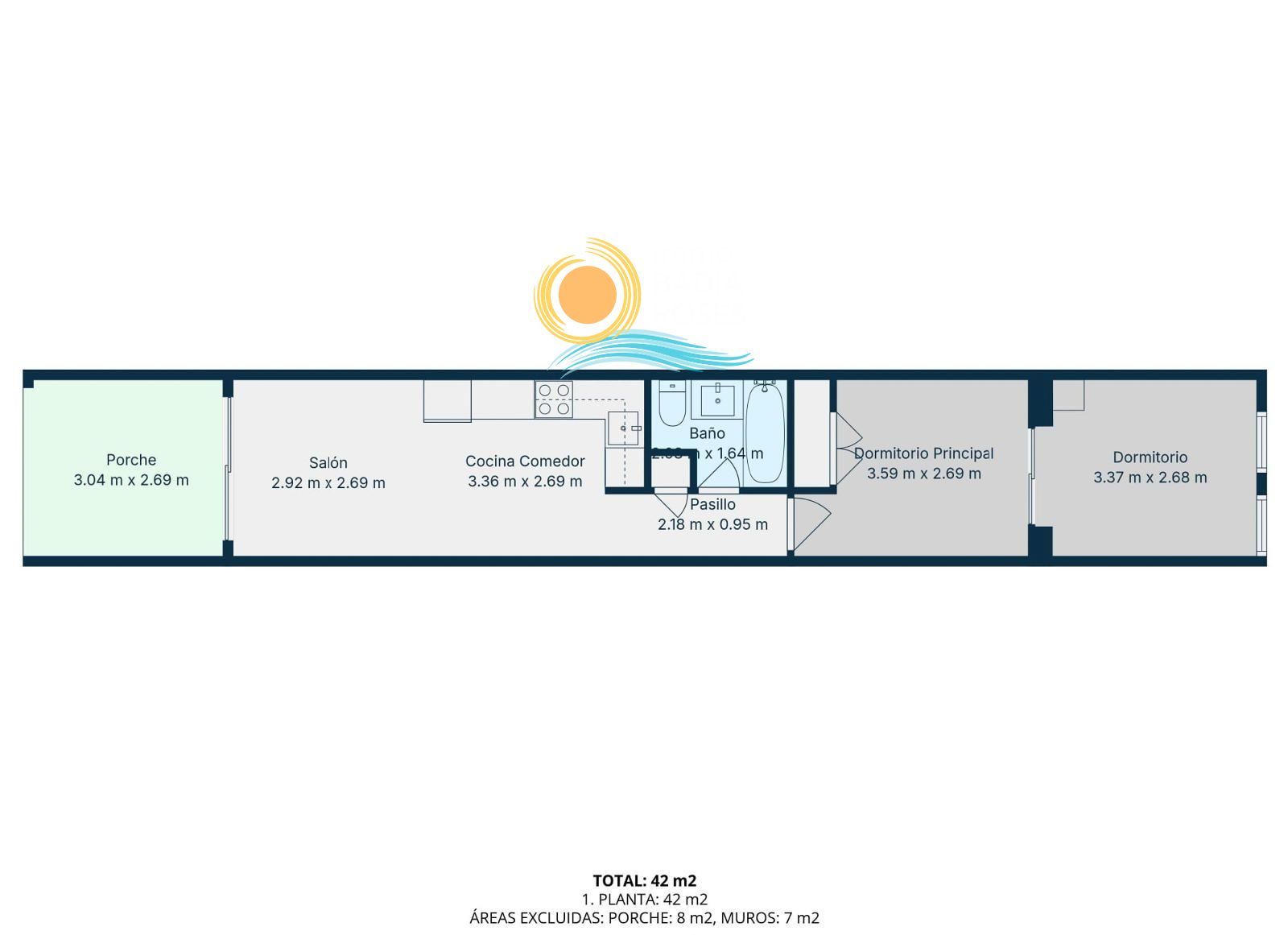 En el interior, el apartamento dispone de un luminoso salón-comedor con cocina americana totalmente equipada, un baño completo y dos dormitorios. Es importante tener en cuenta que el segundo dormitorio se encuentra a continuación del primero, lo que lo convierte en una excelente opción como habitación infantil, despacho o vestidor.